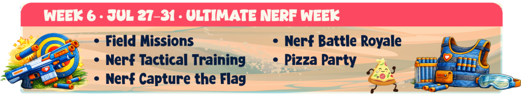 Get ready for the most action-packed week of the summer! Ultimate Nerf Week transforms the dojang into a full-scale tactical training zone where campers become part of exciting Nerf missions and team battles. Campers will practice strategy, teamwork, and quick thinking through activities like Nerf Tactical Training, Field Missions, and high-energy Nerf Capture the Flag challenges. As the week builds toward the ultimate showdown, campers will compete in an epic Nerf Battle Royale, putting their skills to the test in the final battle. We’ll celebrate an incredible week of fun with a Pizza Party finale, making it a week full of action, teamwork, and unforgettable memories!