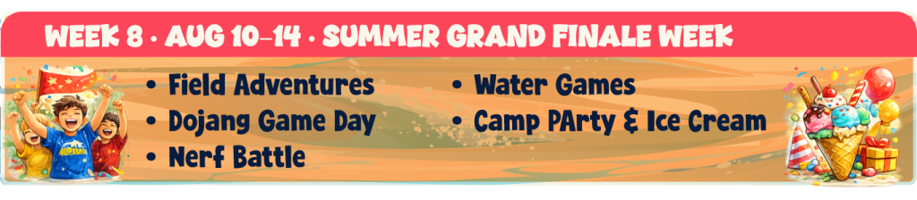 We close out the summer with our Summer Grand Finale Week, an action-packed celebration filled with some of our campers’ favorite activities from the entire season. Campers will enjoy exciting field adventures, high-energy Dojang Game Day competitions, and an epic Nerf Battle as teams compete in fun tactical challenges. The week also features refreshing water games to keep everyone cool and active. We wrap up the summer with a special Camp Party & Ice Cream Celebration, giving campers the chance to celebrate their achievements, friendships, and an unforgettable summer at DKFA Camp.